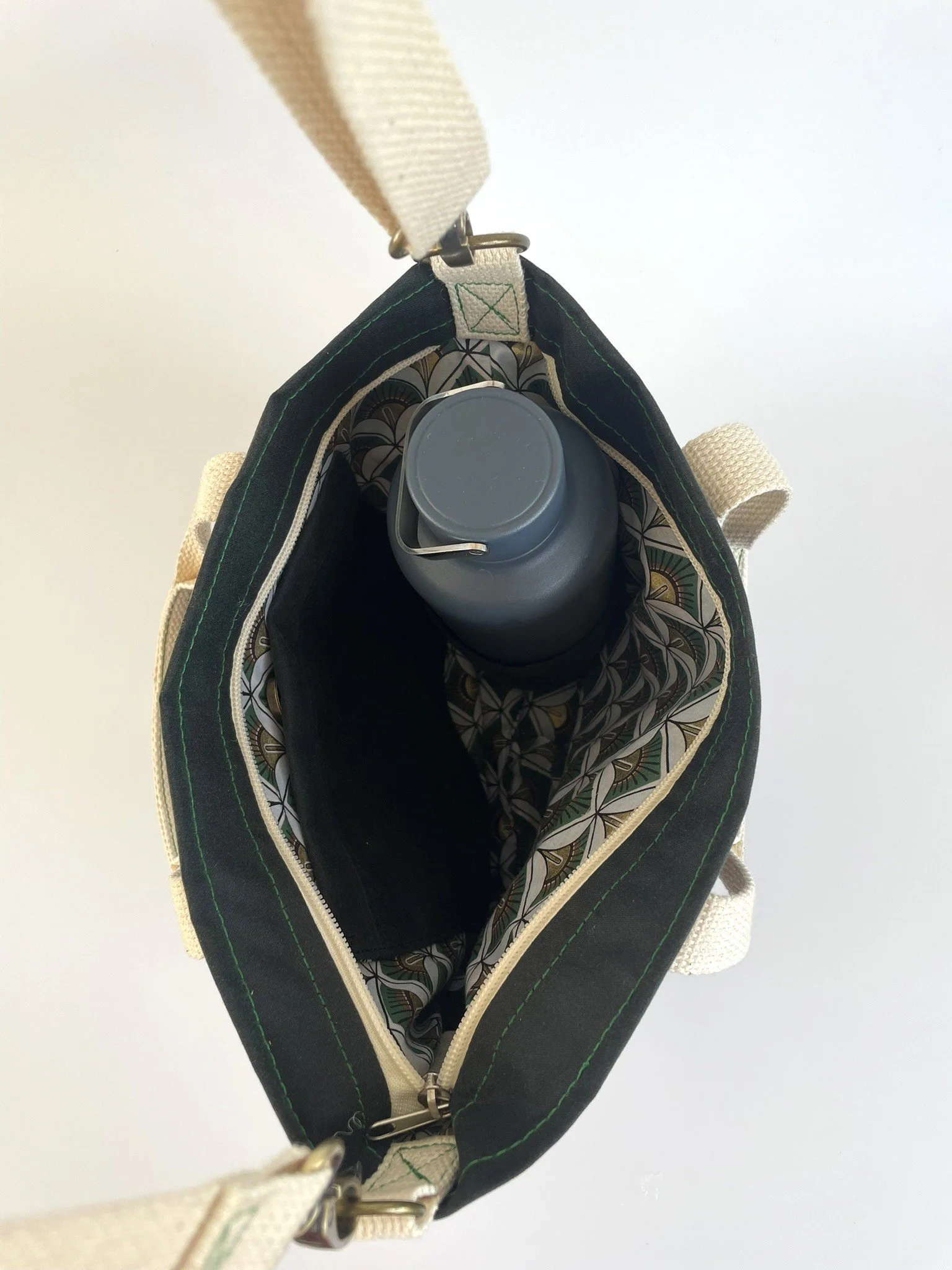 This model features a dark Green Walker & Hawkes waxed cotton outer shell, lined with an art deco motif print cotton and cream cotton webbing straps