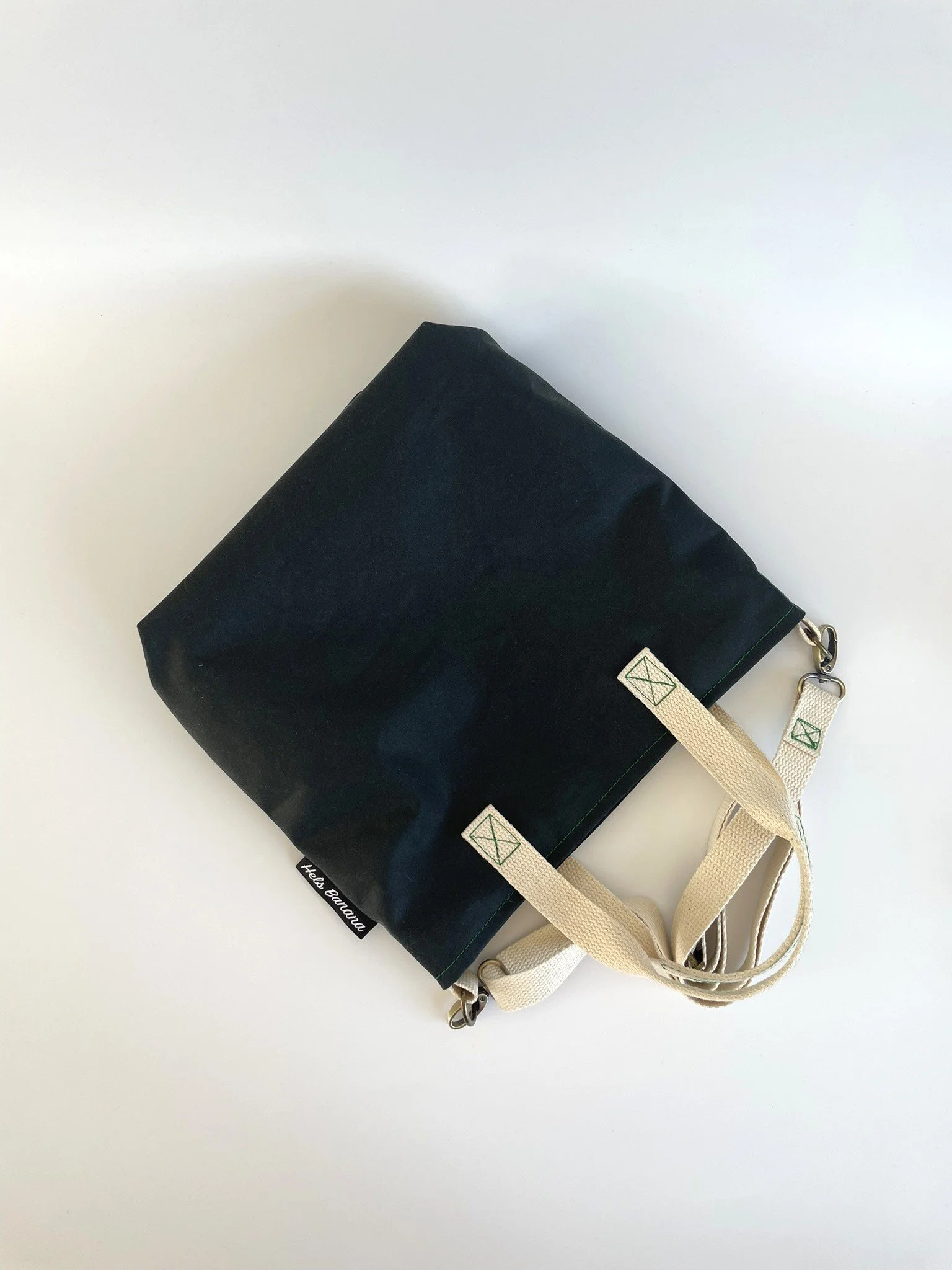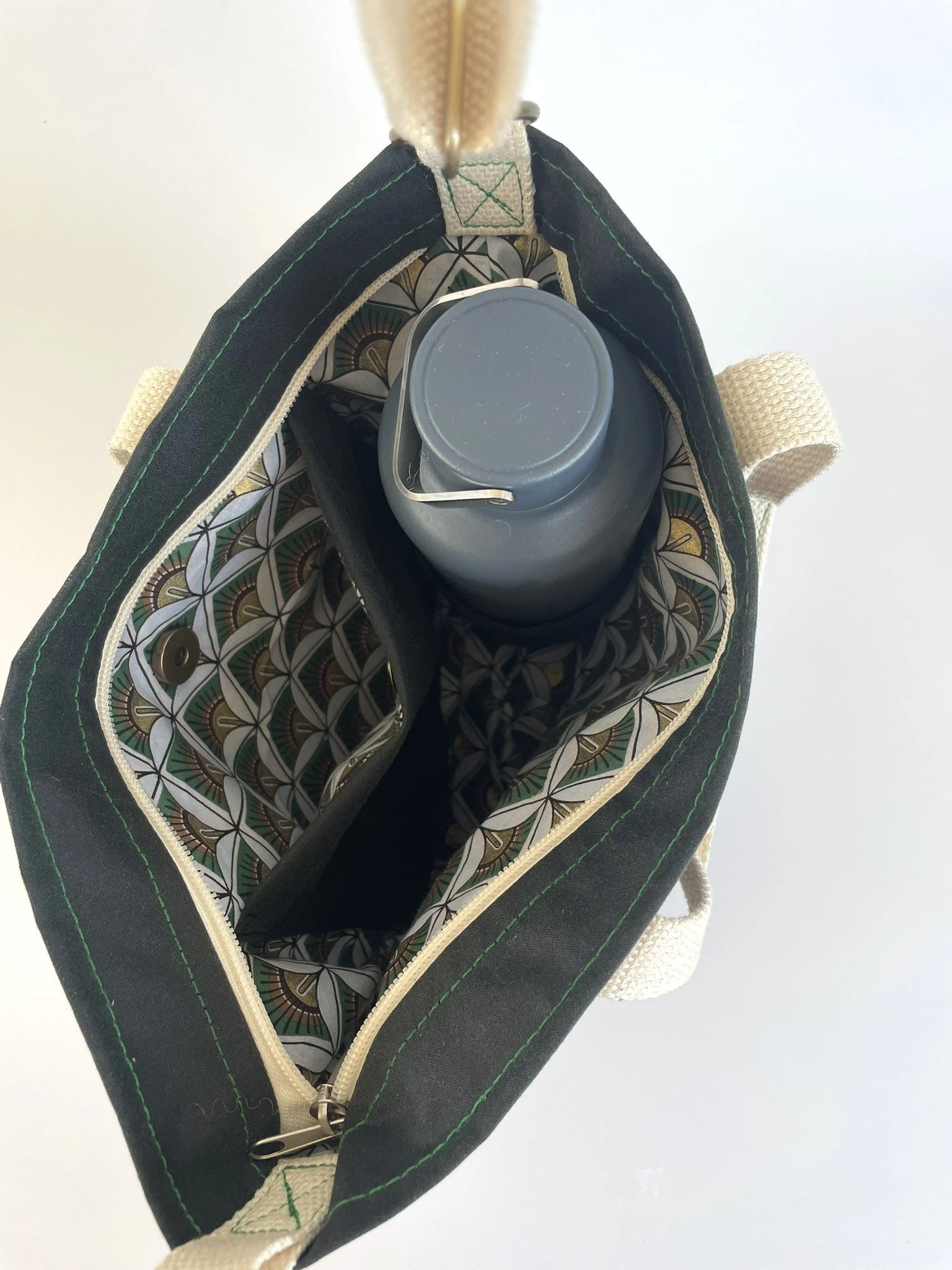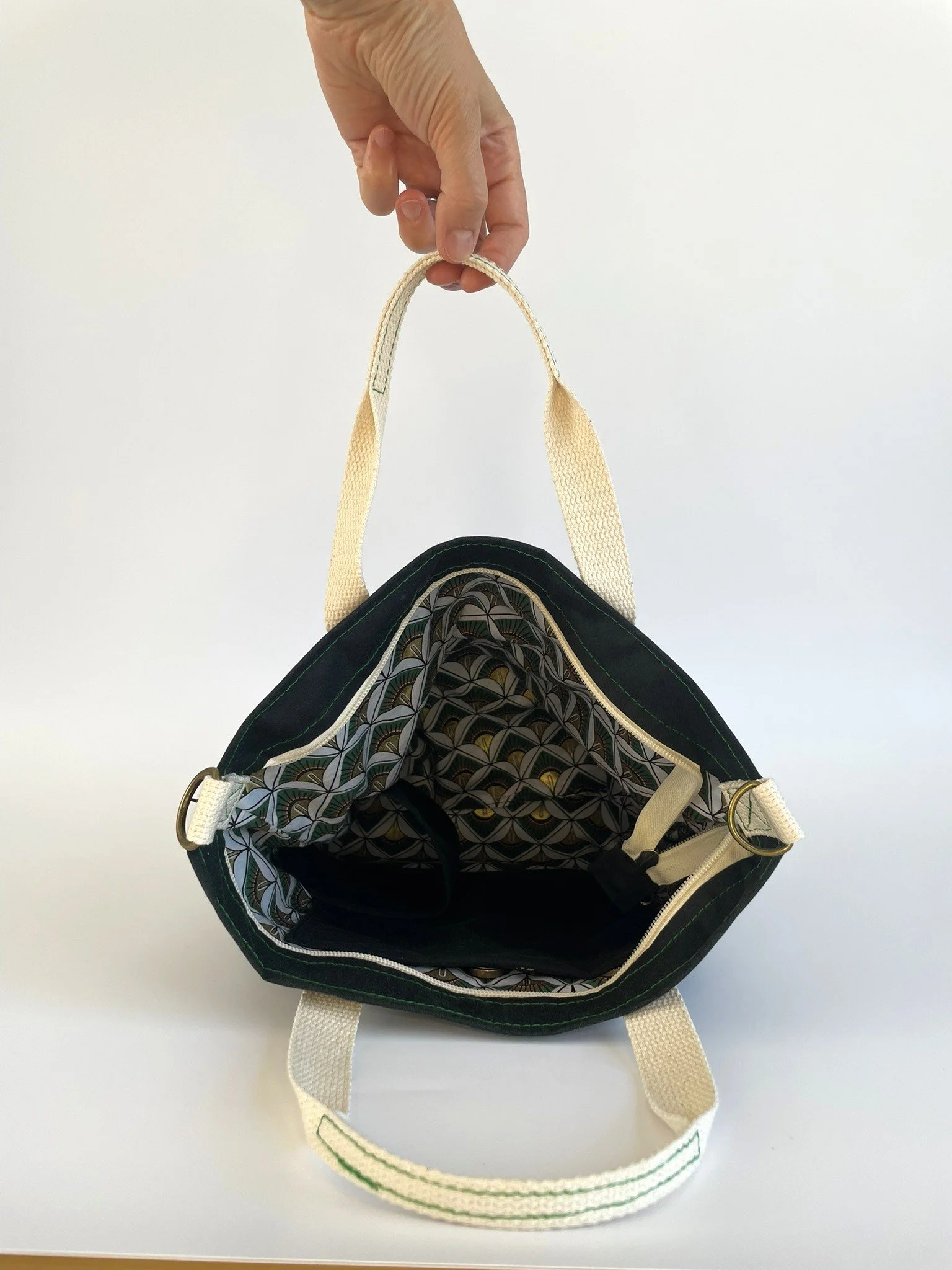 Navy Walker & Hawkes waxed cotton outer shell, lined with an art deco print cotton and cream cotton webbing straps
