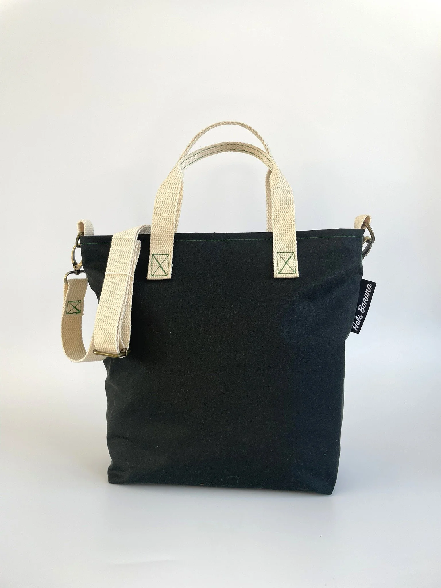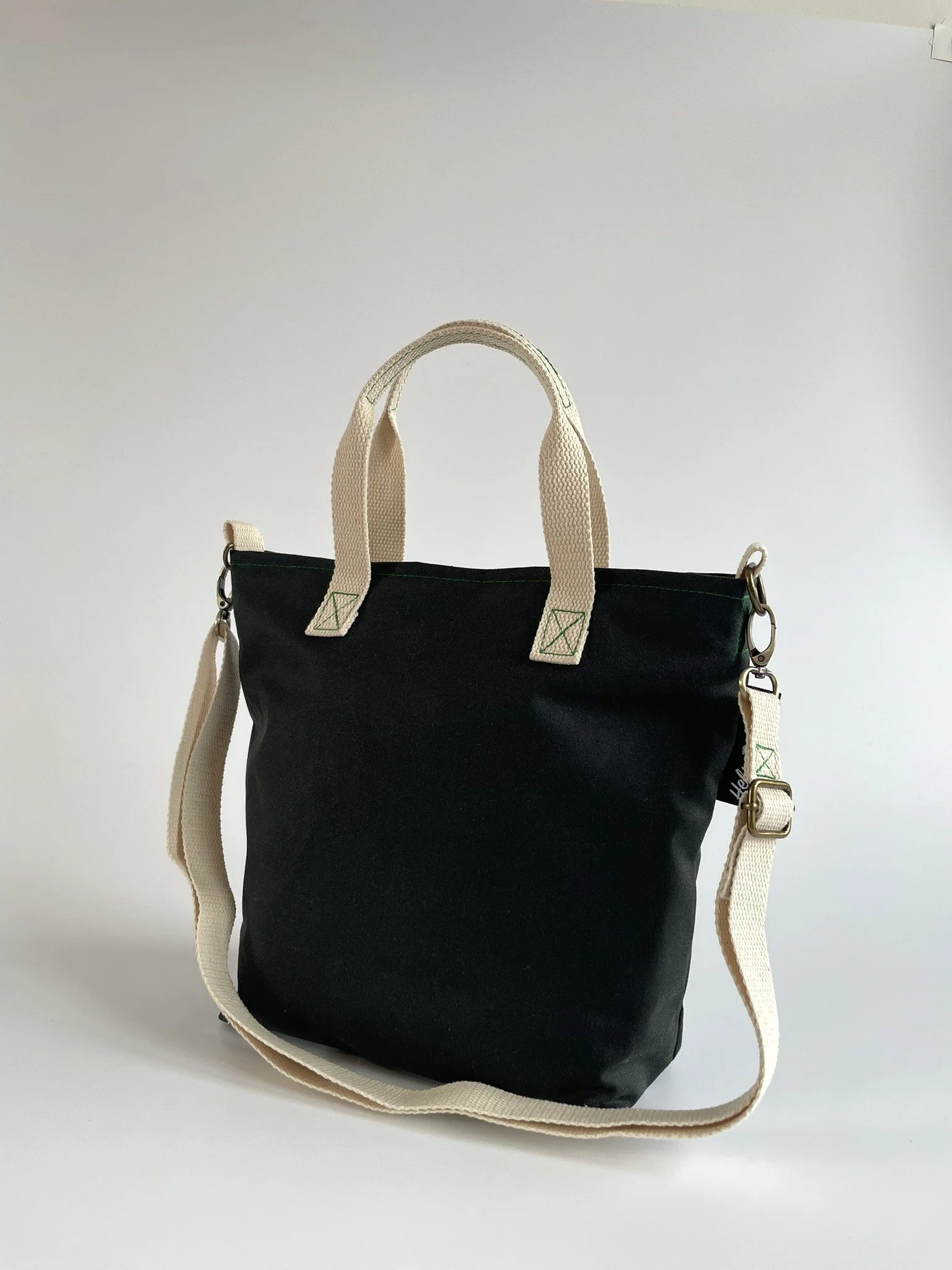 Black and White heavy weight woven cotton tapestry outer shell, lined with a plain pink cotton and cream cotton webbing straps