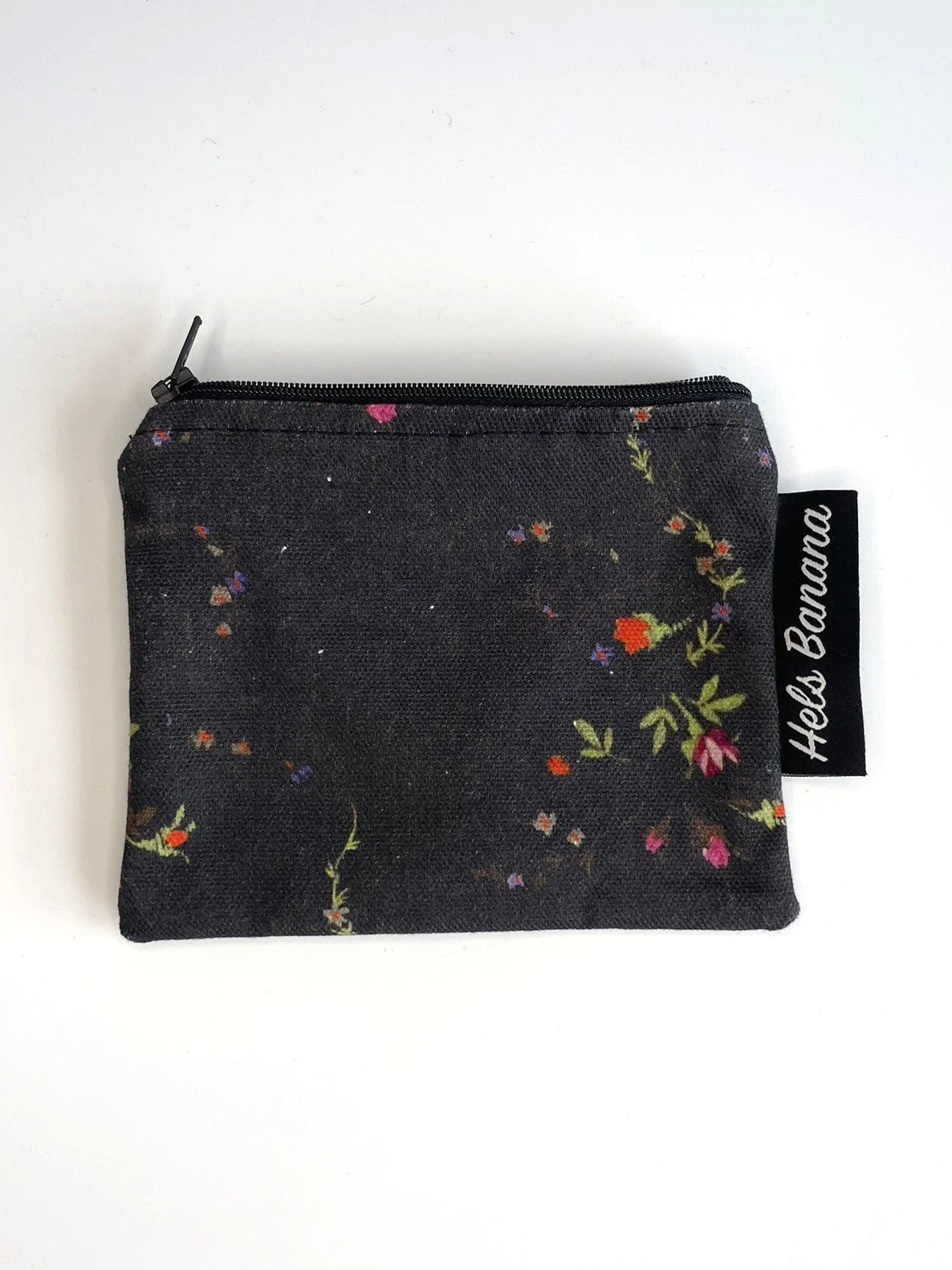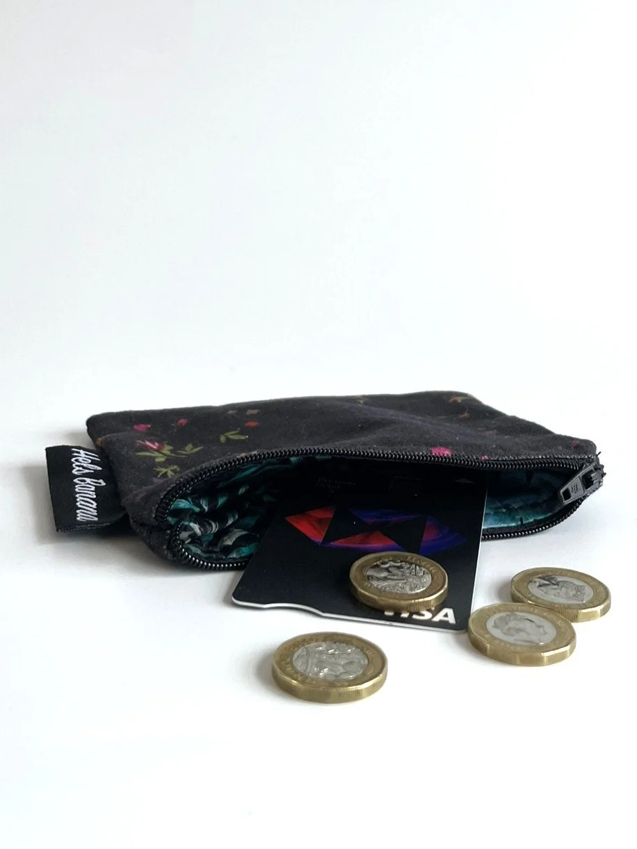 This elegant coin purse measures approximately 13cm x 11 cm coin. It is made from a Donna Ida cotton print and lined in a black and turquoise palm print cotton. Perfect for your coins and cards, easy to pop in your bag or slip in your pocket for a quick and stylish run to the shop!